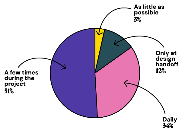 This is consistent with most respondents (51%) saying that developers and designers should collaborate a few times during the project and only 34% saying they should collaborate daily. 12% think it’s only required at design handoff.